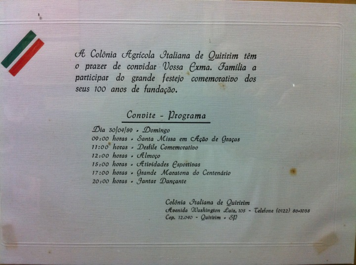 Data marcada restava correr atrás dos preparativos. Começamos a divulgar e de imediato o Delmo João Carlos Montesi, Geraldo Valério Filho e Antonio Marcelo Pistilli se engajaram a nossa ideia. De fim de janeiro até começo de abril saiamos todos os sábados convidando e pedindo uma colaboração para os descendentes de famílias italianas de Quiririm, percorremos todo o Vale do Paraíba.