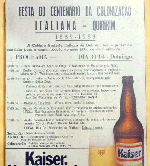 A primeira vez que ouvi falar sobre os 100 anos da imigração italiana em Quiririm foi em novembro de 1988. Como era habitual naquele ano, nos reuníamos na casa do Rubinho Fernandes todos os sábados a tarde para praticarmos a técnica da meditação transcendental. Em um desses sábados chegou a Suzete Alvarenga e me falou que tinha lido no jornal Folha de São Paulo que a Colônia de Quiririm faria 100 anos no próximo ano.